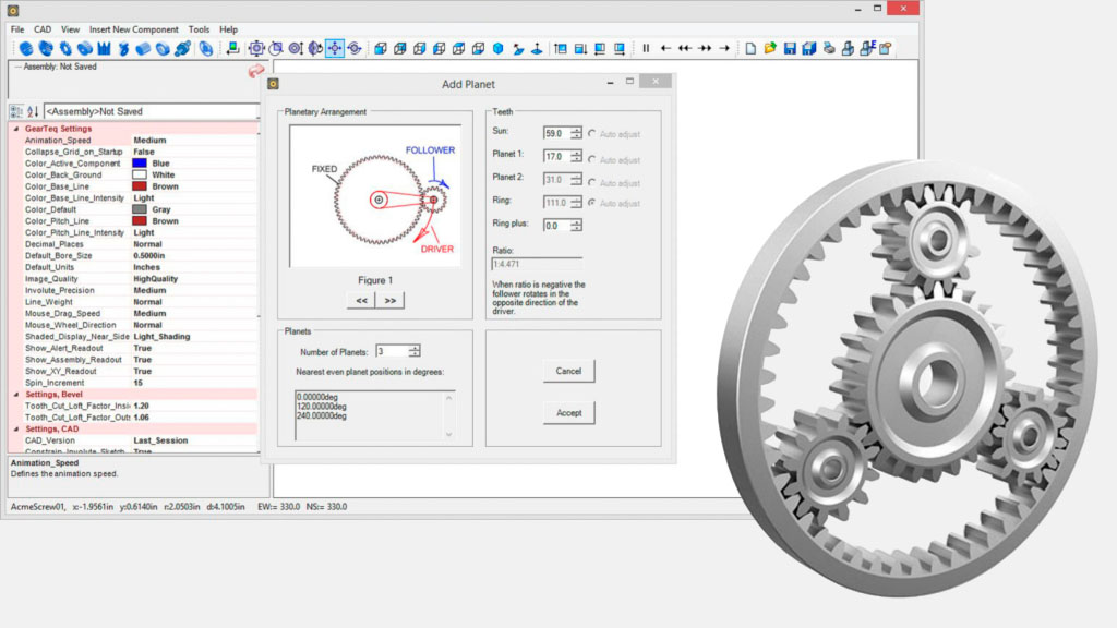 O GearTeq tem um módulo para criação de redutores epicicloidais. Defina rapidamente as engrenagens planetárias, solar e anelar. Crie o desenho em 3D dentro do SOLIDWORKS.